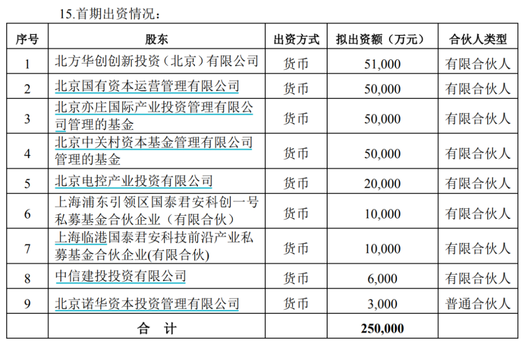 在出资方面,北京国资背景的机构中,华创创投拟认购5.1亿元,北京国管拟认购5亿元,北京亦庄国际产业投资管理有限公司管理的基金(亦庄产投)拟认购5亿元,北京中关村资本基金管理有限公司管理的基金拟认购5亿元,北京电控拟认购2亿元。此外,上海浦东引领区国泰君安科创一号私募基金合伙企业、上海临港国泰君安科技前沿产业私募基金合伙企业、中信建投投资有限公司以及北京诺华资本投资管理有限公司(诺华资本)也分别表达了认购意向,剩余5亿元将由基金管理人诺华资本通过市场化方式募集。