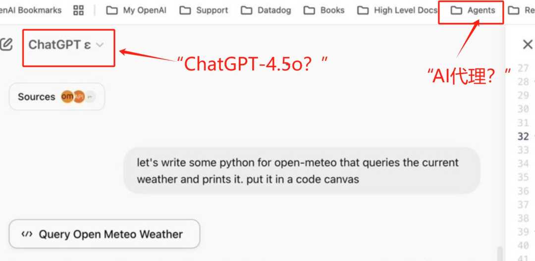 在直播过程中,OpenAI或有意或无意地透露了新品的存在。名为“ChatGPT ε”的模型被推测为GPT-4.5o版本,而神秘的“代理”(Agents)文件夹则被视为“AI代理”即将发布的信号。