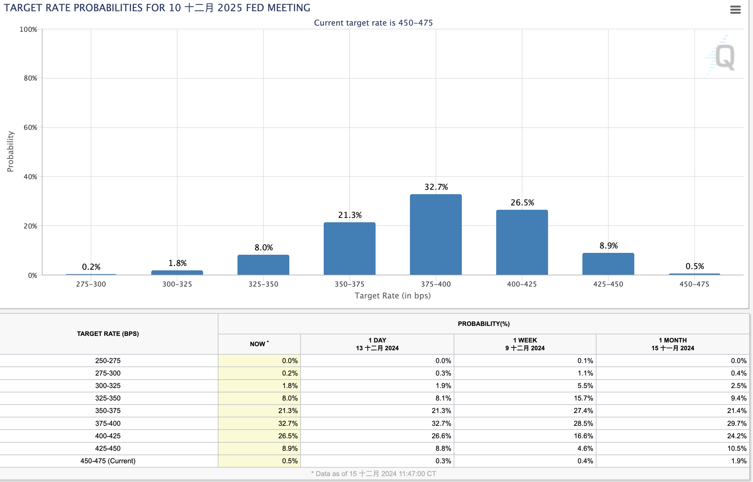 分析人士指出,近期顽固的通胀数据是导致市场对美联储2025年降息预期大幅波动的主要因素。美国11月CPI同比增长2.7%,核心CPI同比增长3.3%,均显示出通胀压力依然存在。此外,核心个人消费支出(PCE)价格指数也呈现上升趋势,进一步加剧了市场对通胀的担忧。