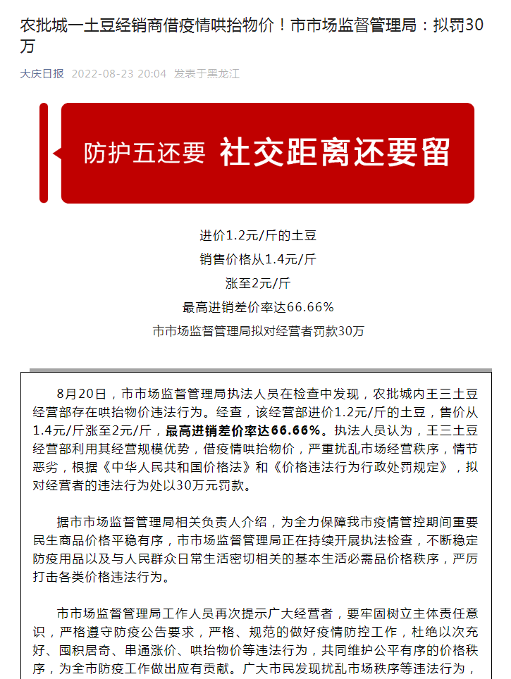 8月20日,大庆市市场监督管理局执法人员在检查中发现,农批城内王三土豆经营部存在哄抬物价违法行为。执法人员认为,该经营部利用其经营规模优势,借疫情哄抬物价,严重扰乱市场经营秩序,情节恶劣,因此拟对其处以30万元罚款。