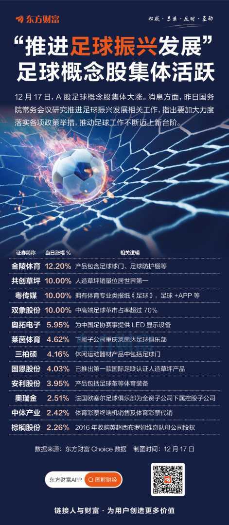 12月17日,A股足球概念股逆势大涨,金陵体育等个股领涨。国务院常务会议研究推进足球振兴发展,足球产业盈利模式多元,近年来快速增长,市场总规模已达2000亿元以上。