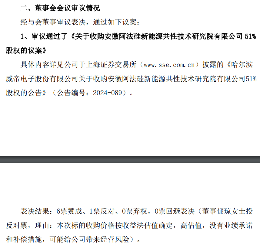 【导读】*ST威帝拟斥资收购阿法硅51%股权,进军乘用车市场,但董事郁琼因估值过高及缺乏业绩承诺投出反对票。