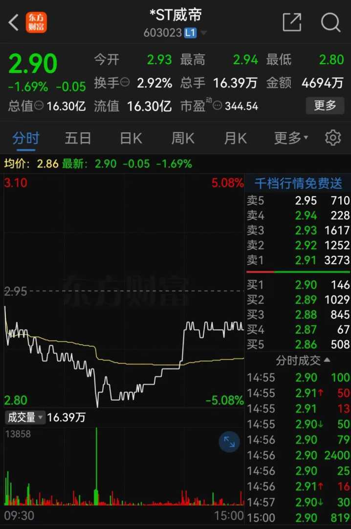 12月16日收盘,*ST威帝股价报2.90元/股,跌幅达1.69%,总市值为16.30亿元。