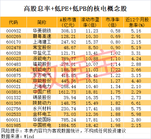 机构调研方面,今年以来,超百只核电概念股获得机构调研,包括江苏神通、中密控股等。其中,江苏神通作为核电阀门的主要供应商,年内累计获得调研29次,排名第一。在核电概念股中,部分个股在现金分红方面表现慷慨,如陕鼓动力、金杯电工等股息率超5%。从估值水平来看,有18只核电概念股最新滚动市盈率低于20倍,且市净率低于2倍。