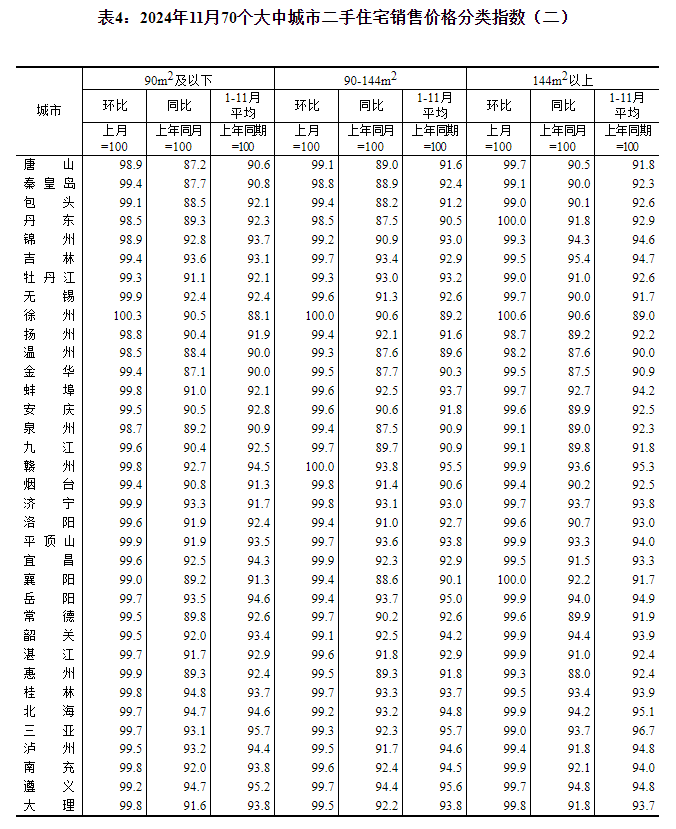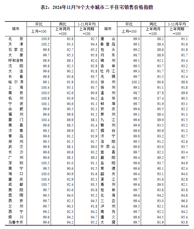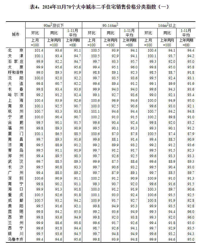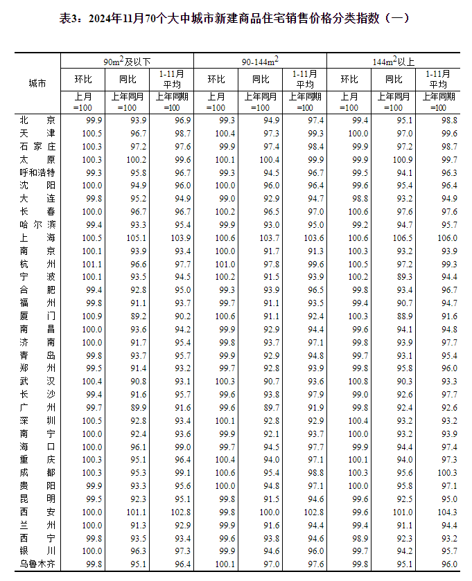 2024年11月份70个大中城市商品住宅销售价格变动情况