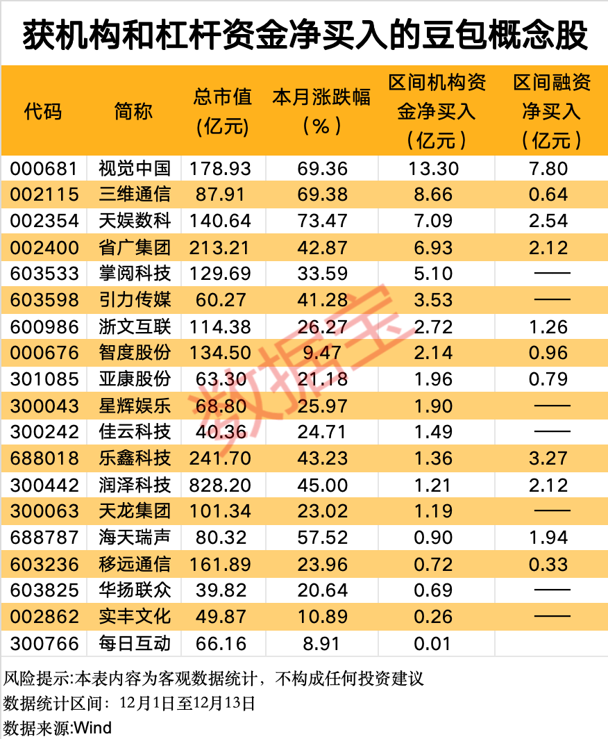 据数据宝统计,自9月24日至12月13日,抖音豆包指数累计涨幅高达101.88%,其中一半以上的股票翻倍。同时,视觉中国、天娱数科、省广集团等多只股票频繁登陆龙虎榜,成交额也迅速放大。在此期间,有14只股票获得杠杆资金大手笔加仓,其中视觉中国最受青睐,融资净买入7.8亿元。此外,机构资金也重金买入多只相关股票。