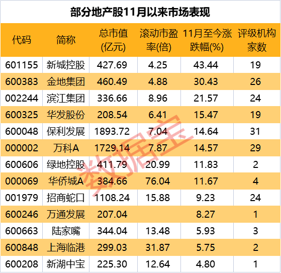 个股方面,总市值200亿元以上的地产股股价集体大涨,其中新城控股累计涨幅居首,高达43.44%,金地集团上涨30.43%,保利发展、万科A涨幅超过14%,招商蛇口涨逾9%。从机构关注度来看,保利发展、万科A、金地集团、滨江集团和招商蛇口等股均受到多家机构的关注。