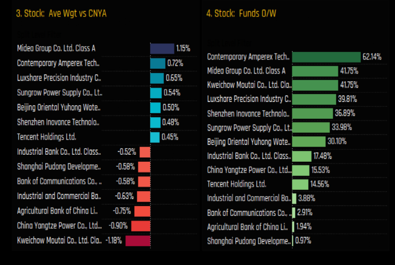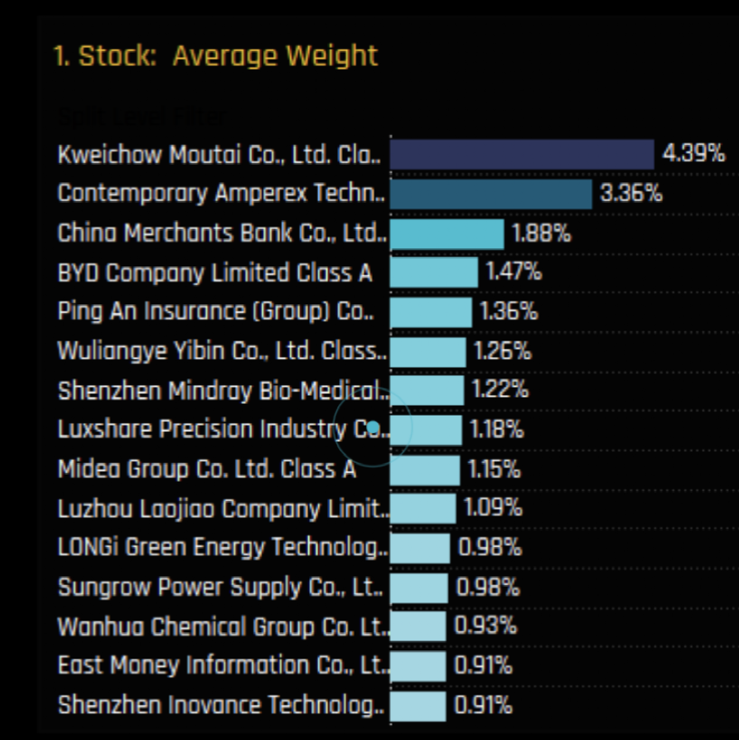 具体来看,这103只海外A股基金的重仓股中,贵州茅台和宁德时代依然占据前两位,但贵州茅台相对于基准低配。此外,银行股如农行、工行、交行等也呈现低配态势。而超配幅度最大的股票包括美的集团、宁德时代、立讯精密、阳光电源、东方雨虹、汇川技术和腾讯控股。值得注意的是,尽管贵州茅台仍被不少基金超配,但超配幅度相对较低,受欢迎程度也不及宁德时代。