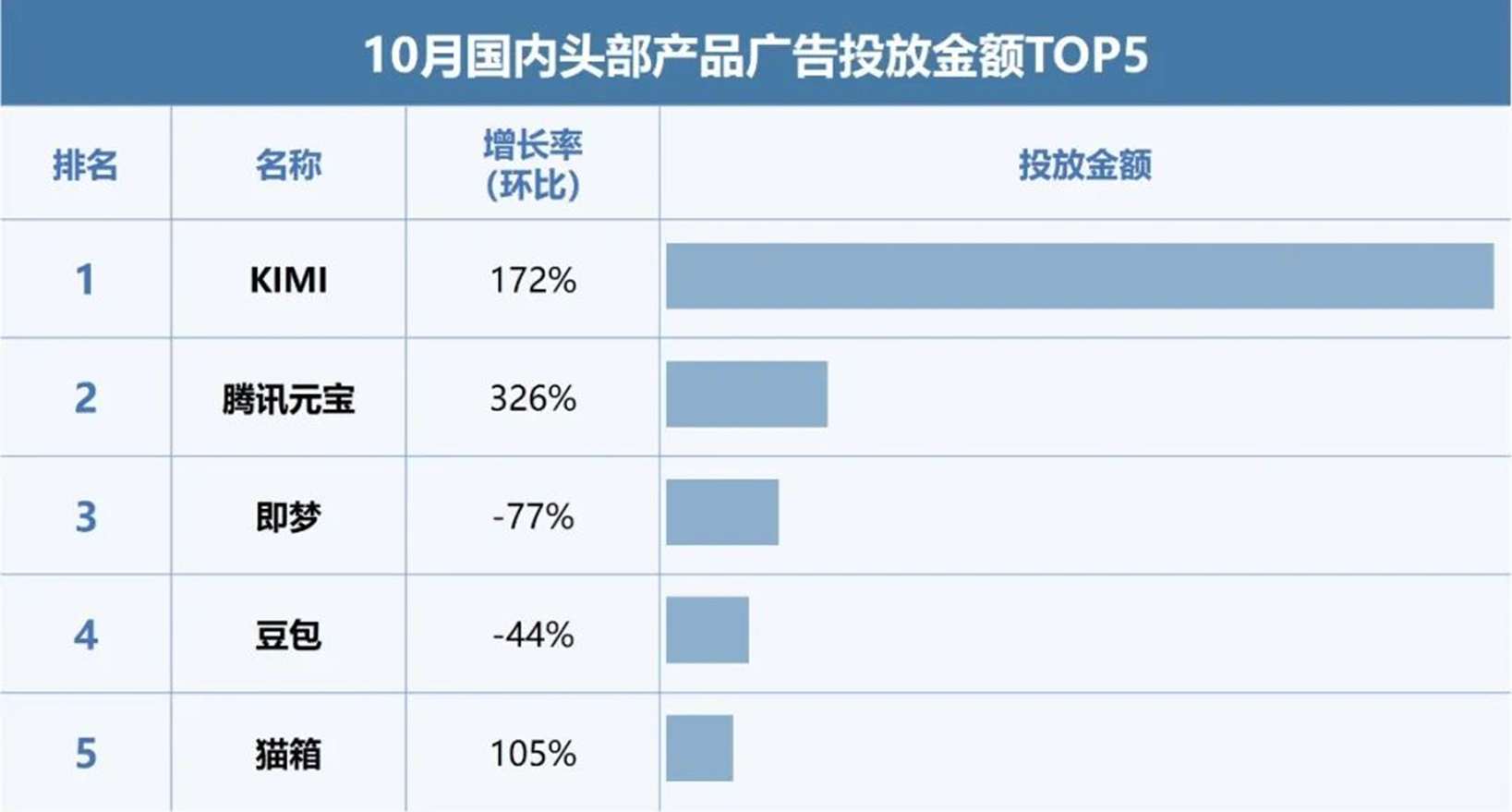 尽管字节跳动的AI起步相对较晚,但“大力出奇迹”的策略使其迅速迎头赶上。目前,花钱投流买量已成为AI产品启动的直接方式,AI应用厂商在烧钱投放广告上毫不手软。数据显示,10月国内头部AI应用广告投放金额超4亿元,近半年翻了5倍。其中,字节旗下的豆包、即梦等产品投放金额显著。