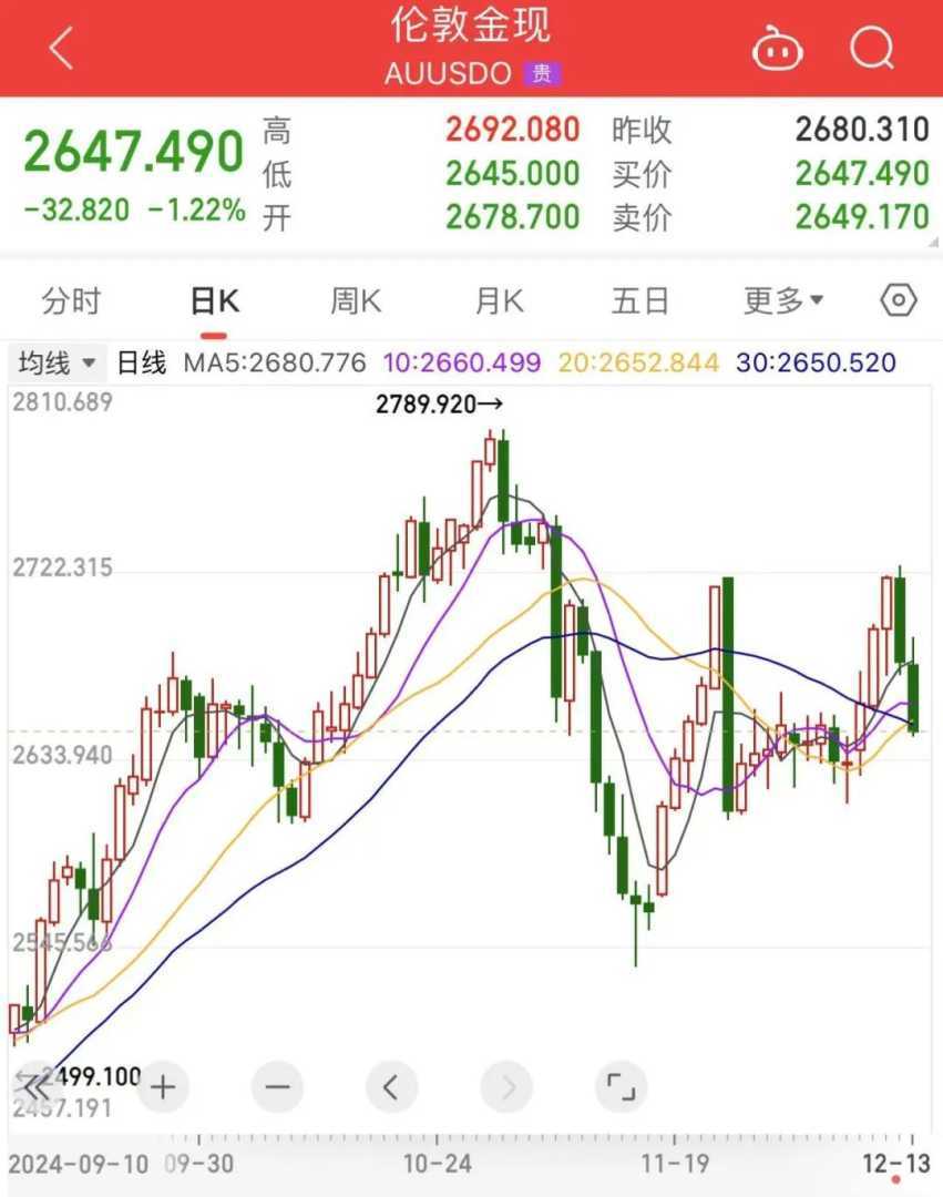 隔夜,伦敦金现(现货黄金)价格再度走低,最低触及2645美元/盎司,单日跌幅为1.22%,最终收于2647.49美元/盎司。期货市场方面,COMEX黄金期货价格也大幅下跌,盘中最低至2663.3美元/盎司,最终收于2665.9美元/盎司。
