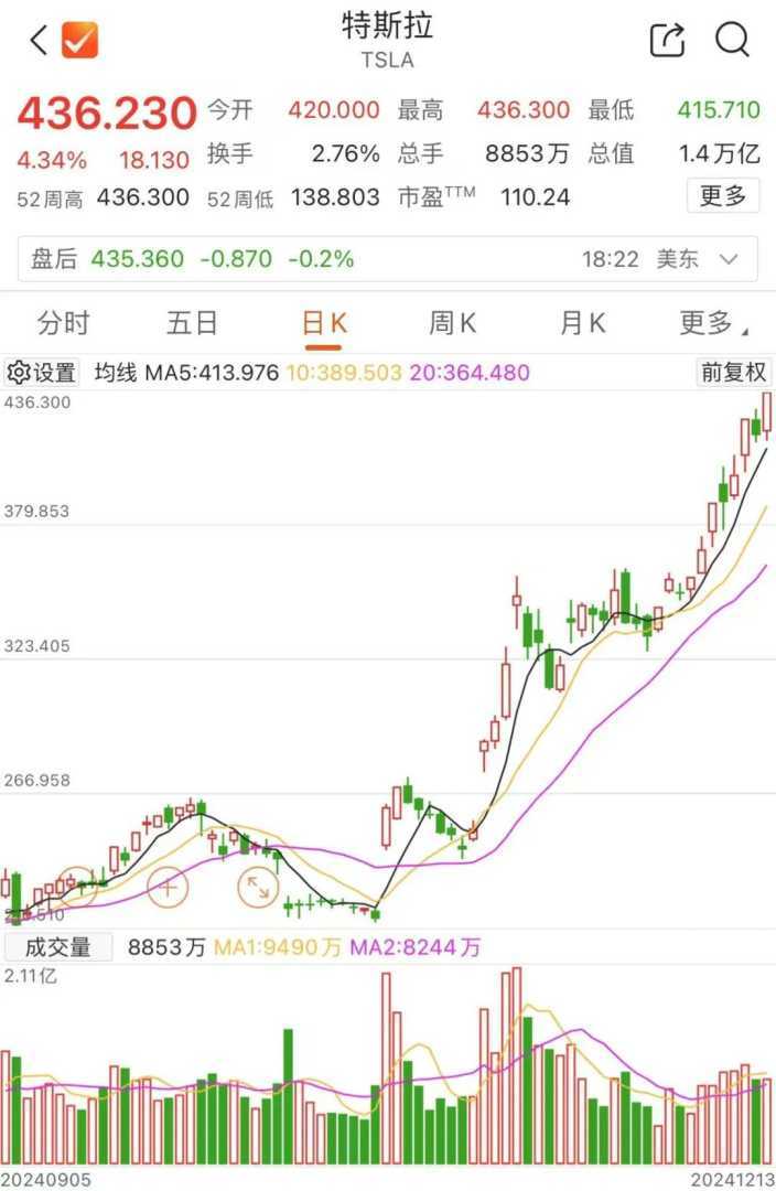 特斯拉股价也继续上涨,涨幅超过4%,创历史新高。有报道称,特朗普过渡团队建议废除要求汽车制造商通报自动驾驶系统相关事故的现行通用命令,这被视为对特斯拉等自动驾驶技术领先企业的利好。