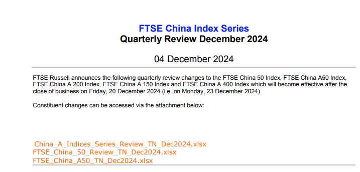 此外,12月4日盘后,富时罗素也宣布了对富时中国50指数、富时中国A50指数等指数的季度审核变更。此次变更将于12月20日(星期五)收盘后生效。值得注意的是,富时中国A50指数将纳入北方华创,同时删除华能水电。备选股名单包括寒武纪-U、中信建投、上汽集团、赛力斯、金龙鱼。这些备选股即刻生效,直到下季度成份股审核前,如果有一个或多个成份股被删除,将选用备选股。