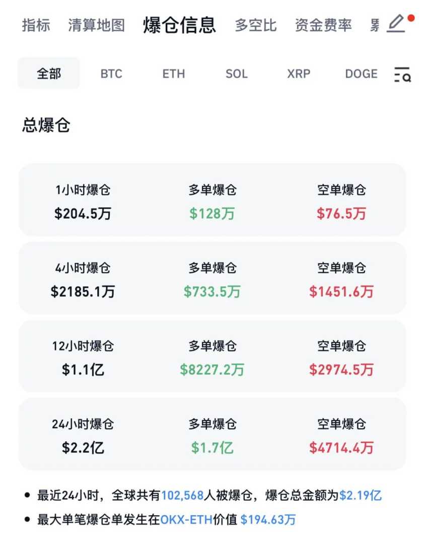 近日,比特币市场维持高位震荡态势,吸引了广泛关注。据Coinglass数据显示,过去24小时内,加密货币市场全网合约爆仓额高达2.19亿美元,涉及10.26万名投资者爆仓。