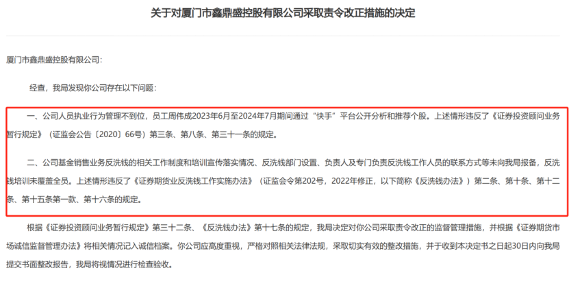 同时,厦门证监局还发现鑫鼎盛控股存在两大问题:一是公司人员执业行为管理不到位,未能有效约束员工违规行为;二是基金销售业务反洗钱的相关工作制度和培训宣传落实情况不到位,反洗钱部门设置、负责人及专门负责反洗钱工作人员的联系方式等未向监管报备,且反洗钱培训未覆盖全员。因此,厦门证监局决定对鑫鼎盛控股采取责令改正的监督管理措施,并将相关情况记入诚信档案。