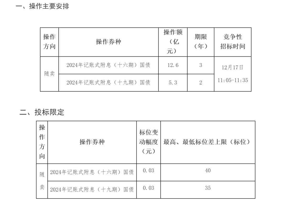 财政部决定开展国债做市支持操作,涉及2024年记账式附息(十六期)国债和(十九期)国债,规模分别为12.6亿元和5.3亿元,竞争性招标时间为12月17日,旨在提升国债市场流动性和交易活跃度。