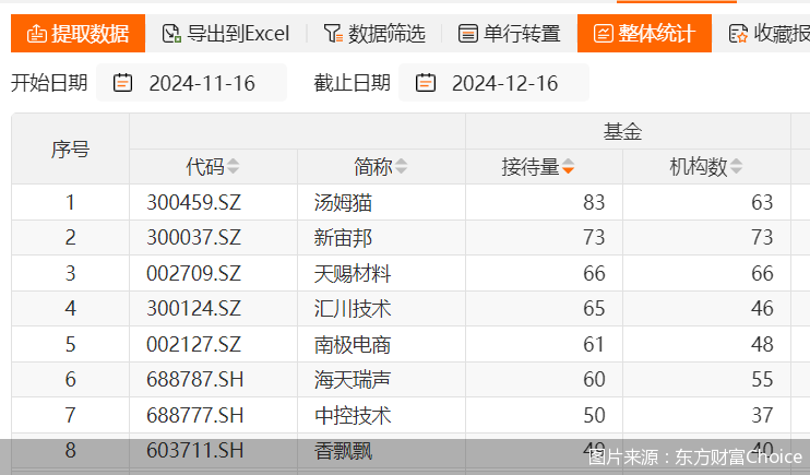 同时,电力设备行业的新宙邦和天赐材料也备受公募基金的青睐,分别接待了73家和66家公募基金公司的调研。此外,汇川技术、南极电商、海天瑞声、中控技术等上市公司也获得了超过50家公募基金公司的调研。
