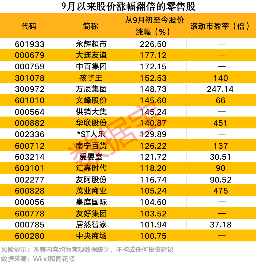 截至12月16日收盘,A股市场零售板块表现亮眼,收报2106.81点,大涨3.48%,逼近9年来历史最高点。其中,新零售概念股人气爆棚,9月以来零售指数涨幅高达84%,领跑A股行业指数。板块内股票区间涨幅均超过15%,18股涨幅超100%,永辉超市涨幅居首,达到226.5%。