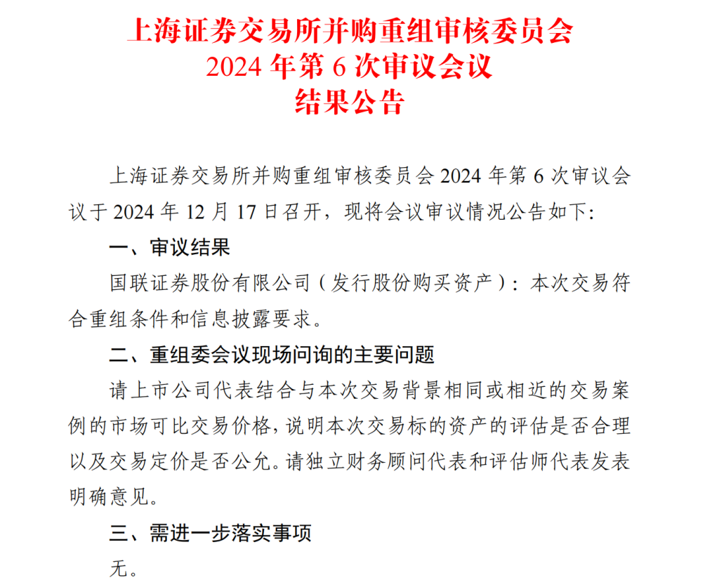 12月17日,上交所重组委发布的公告显示,国联证券(601456.SH,01456.HK)发行A股股份购买民生证券99.26%股份并募集配套资金获审核通过。自9月27日受理以来,该项目在不到3个月的时间内即获交易所审核通过。
