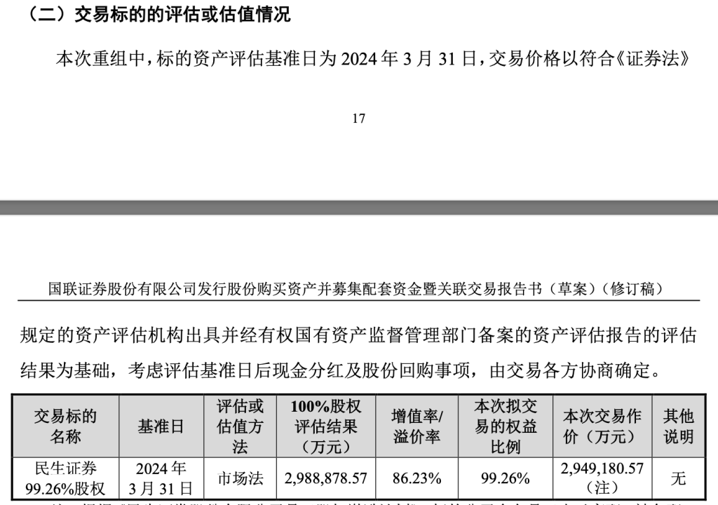在重组委会议现场问询中,上市公司代表被要求结合与本次交易背景相同或相近的交易案例的市场可比交易价格,说明交易标的资产的评估是否合理以及交易定价是否公允。根据公告,国联证券聘请的中联评估对民生证券100%股权进行了评估,评估值为2988878.57万元,增值率为86.23%。在扣除现金分红和回购股份支付后,交易标的资产100%股权对应价值为2971116.68万元。