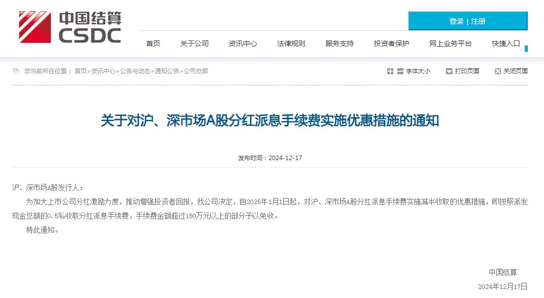 中国结算发布通知,自2025年1月1日起,沪、深市场A股分红派息手续费将实施减半优惠,旨在鼓励上市公司加大分红力度,保障投资者回报,推动资本市场健康发展。