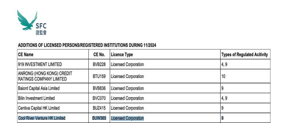 字节跳动联合创始人张一鸣创立的“Cool River Venture HK Limited”于2024年11月21日正式获得香港证监会颁发的9号牌——资产管理牌照,这标志着该机构可在香港开展资产管理业务。该消息尚未得到字节跳动的官方回应。