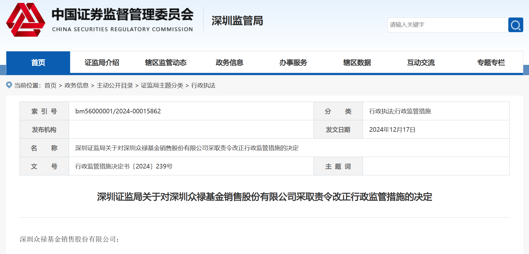 12月17日,深圳证监局发布消息称,深圳众禄基金销售股份有限公司(简称“众禄基金”)因多项违规行为被责令改正。据悉,众禄基金存在的问题包括业务及公司人员独立性不足、违规开展基金销售以外业务、设立子公司并提供借款且未完成整改、变相公开宣传推介私募基金及未严格执行私募产品准入流程,以及基金销售活动激励不当、关键岗位人员未取得从业资格、未报送高级管理人员任职备案材料、人员投资行为管理制度缺失等。