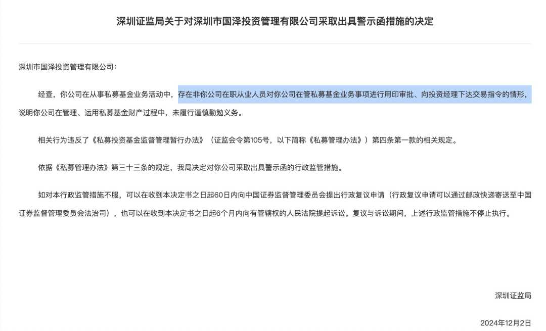 今年以来,证券类私募行业频现违规操作,多家机构因非公司员工参与募、投、退环节及用印审批不当被监管部门处罚。深圳证监局12月16日披露,国泽投资因非在职员工对私募基金业务进行用印审批和下达交易指令,被出具警示函。