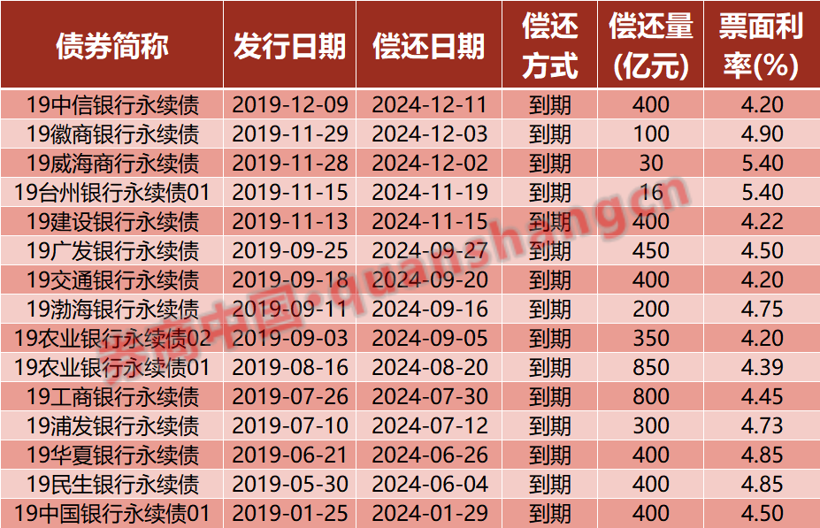 近日,中信银行宣布已全额赎回2019年发行的400亿元永续债,标志着2019年首发永续债的15家银行中,已有14家完成全额赎回,总规模达5496亿元。最后一家平安银行也将于12月26日赎回200亿元永续债。2024年作为永续债首个赎回大年,银行永续债发行规模已超7000亿元,远超过去五年年均水平。