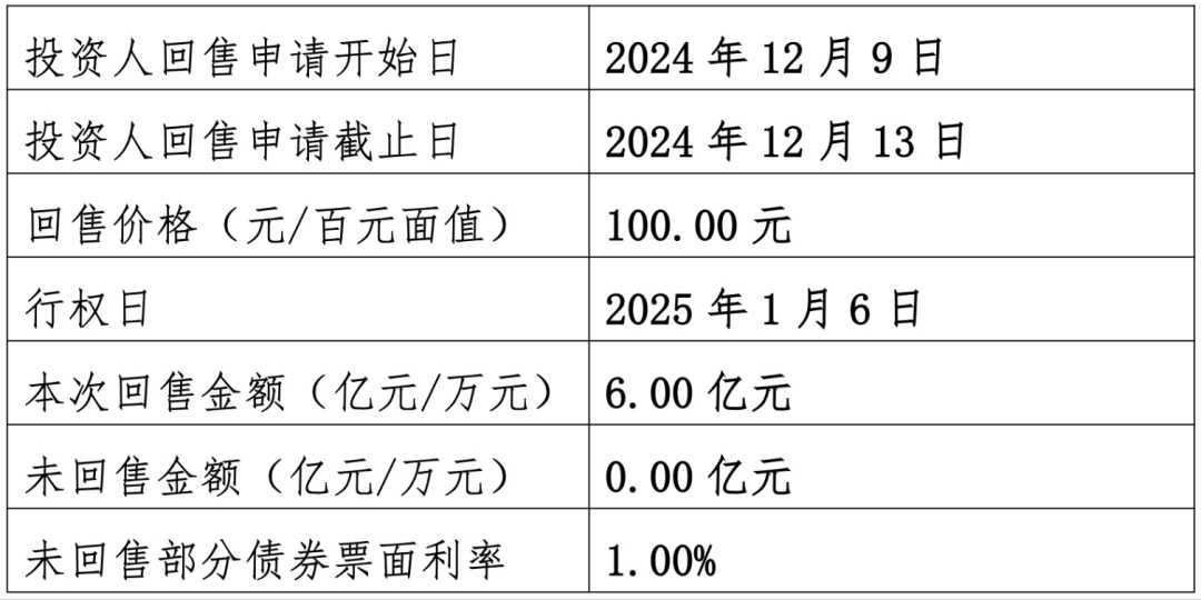 根据公告,本期债券的首次回售申请期限为2024年12月9日至12月13日,行权日则定于2025年1月6日。截至12月17日,本次回售金额达到了全额6亿元,未回售金额则为0万元,显示出投资者对该债券的高度认可和信心。