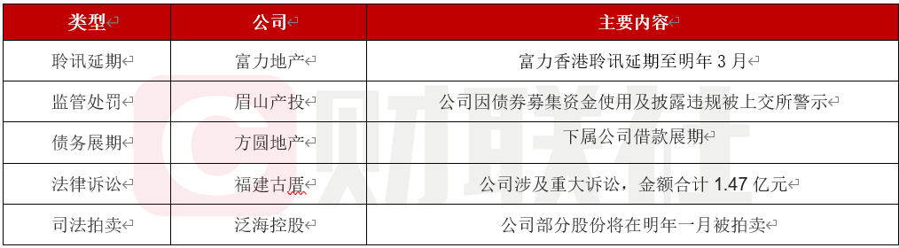 富力地产香港呈请聆讯延期至明年3月,眉山产投因债券违规被上交所书面警示,方圆地产下属公司债务展期但被列入失信名单,福州古厝涉重大诉讼被要求支付1.47亿元,泛海控股控股股东所持股份将被司法拍卖。