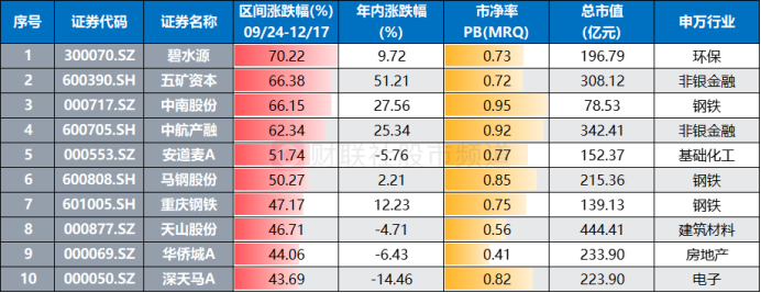 注:9月24日以来涨幅居前的破净央企股(截至12月17日收盘)
