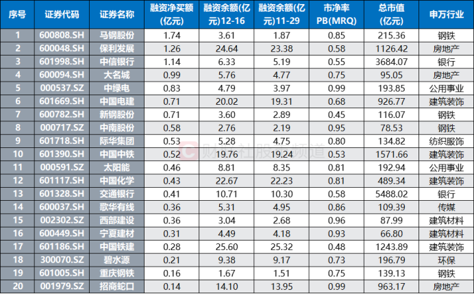 注:本月融资净买额居前的破净央企股(融资余额截至12月16日,其余数据截至12月17日)