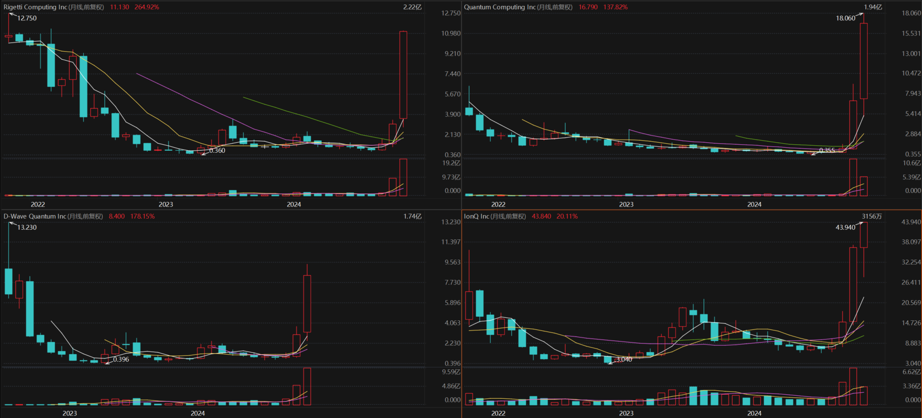 受多方消息刺激,美股量子计算行情迎来爆发。最近一个交易日,多家量子计算相关企业股价大幅上涨。其中,Quantum Computing上涨51.53%,Rigetti Computing上涨32.03%,D-Wave Quantum上涨16.18%,IonQ上涨4.86%。自12月以来,上述个股股价大多实现翻倍增长。