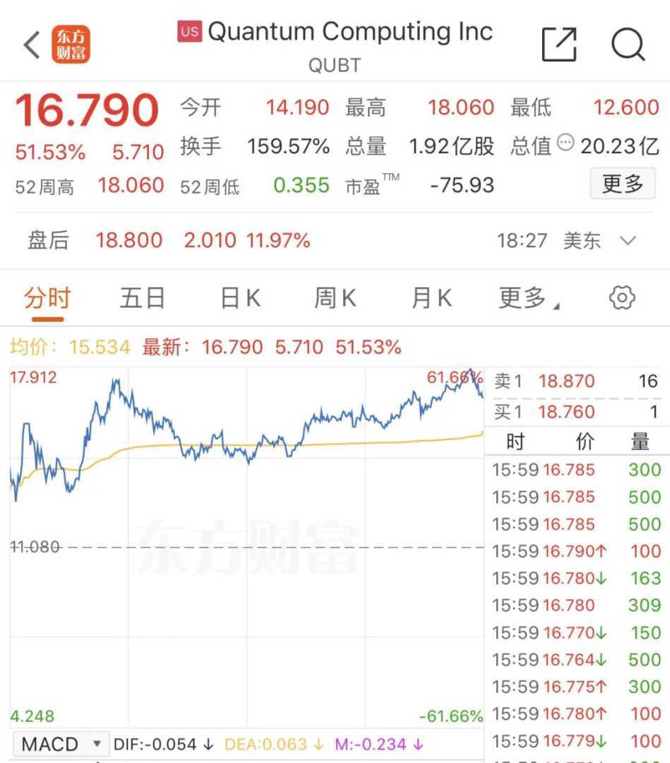 量子计算公司年内股价飙升,成为市场焦点。当地时间12月17日,美股三大指数收跌,道指更是连续第九个交易日下跌,创下1978年以来最长连续下跌纪录。尽管市场整体表现不佳,但量子计算公司(Quantum Computing)股价却逆势大涨51.53%,一度触发熔断,盘后继续上涨12%。该股年内涨幅已高达约1740%,成为市场中的明星。