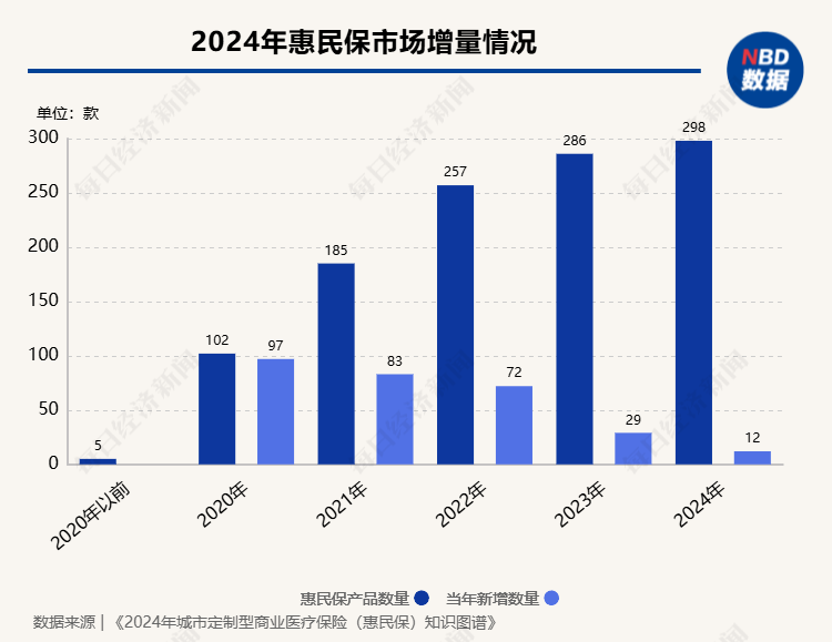 增量回调,中国惠民保市场步入稳定发展期。自2020年以来的爆发式增长后,惠民保市场经过五年发展,现状如何?在第四届复旦大学普惠保险与创新论坛上,许闲教授团队发布的《2024年城市定制型商业医疗保险(惠民保)知识图谱》报告给出了答案。截至2024年10月31日,全国共推出298款地方性惠民保产品,其中年内新增12款,相较于前几年,新增速度有所放缓。