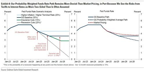 不少华尔街大行近来已经开始预期美联储明年可能会少降息一次,总共可能只会降息75个基点,甚至有人预测最终可能只会降息50个基点。高盛预计,美联储点阵图的中值将显示2025年降息三次至3.625%,2026年降息两次至3.125%,2027年利率持平于3.125%,这些预估均比9月份点阵图高出25个基点。