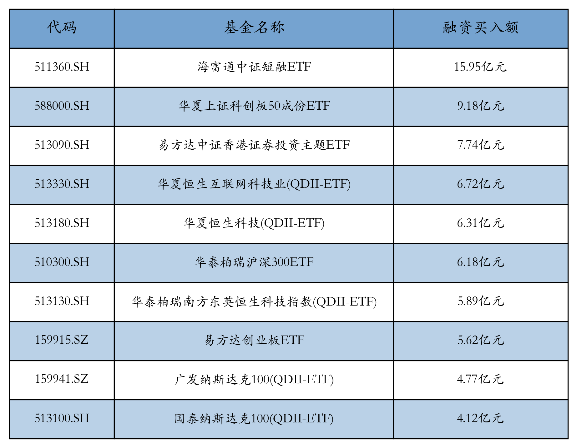 ETF融资买入额方面,海富通中证短融ETF以15.95亿元的买入额位居榜首,华夏上证科创板50成份ETF和易方达中证香港证券投资主题ETF分别以9.18亿元和7.74亿元紧随其后。前十名具体数据请见下表: