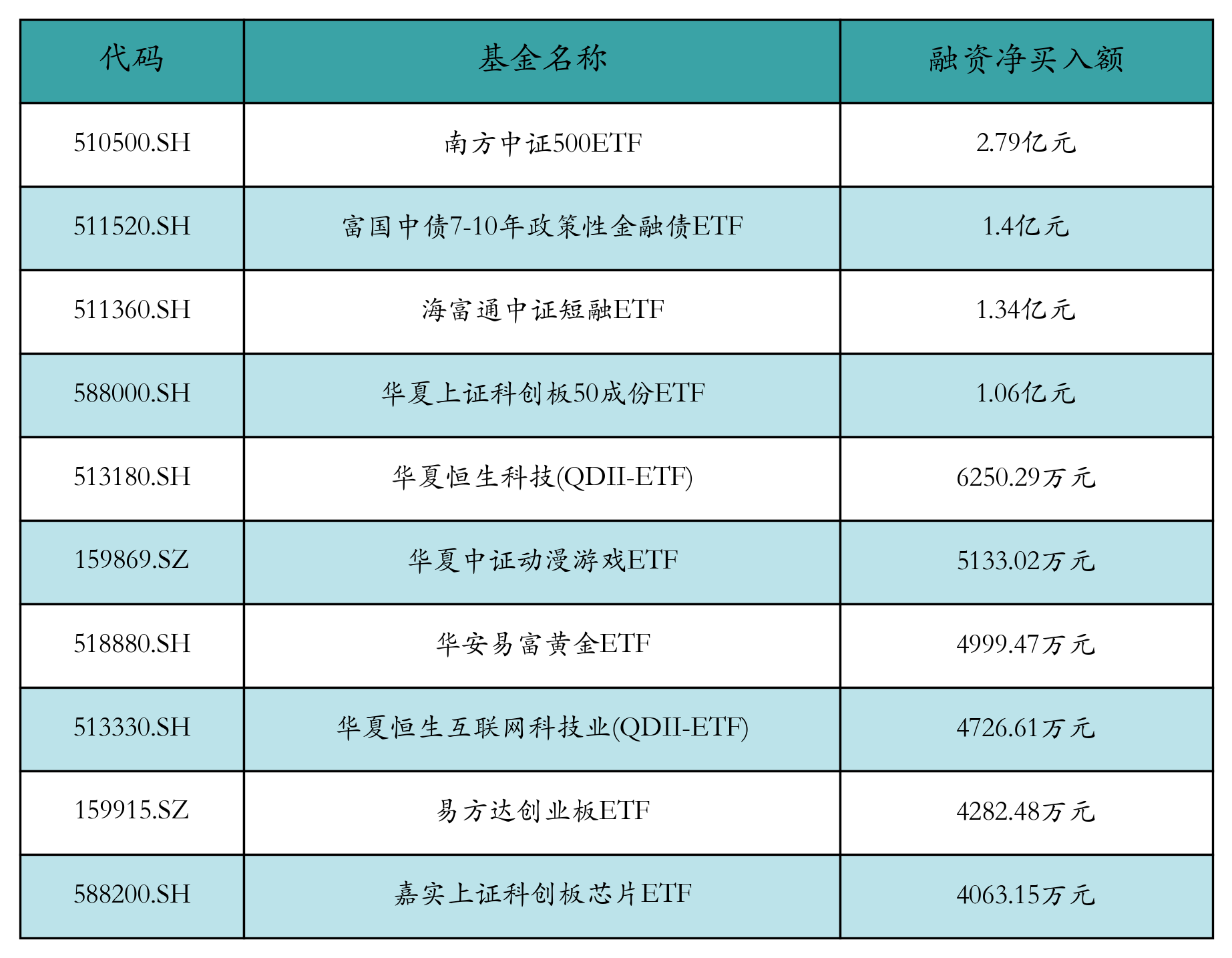 ETF融资净买入额前三