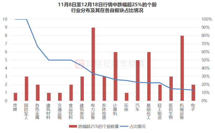 分行业看,筛选11月8日至12月18日跌幅超25%的个股,电力设备、机械设备、基础化工、计算机、汽车股数量居前。按各自板块比例统计,传媒、国防军工、有色金属等板块近期跌超25%的个股占比较高。