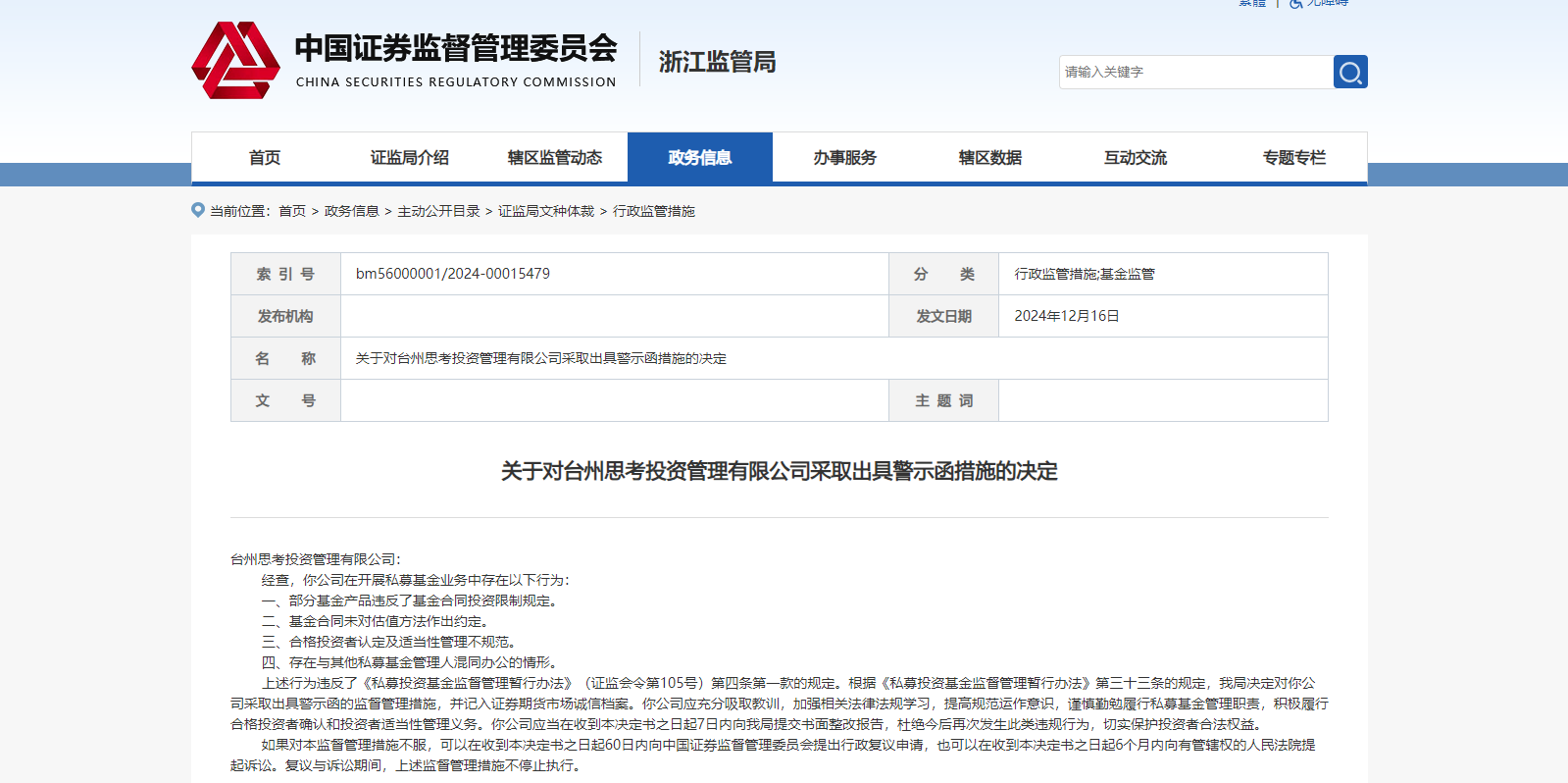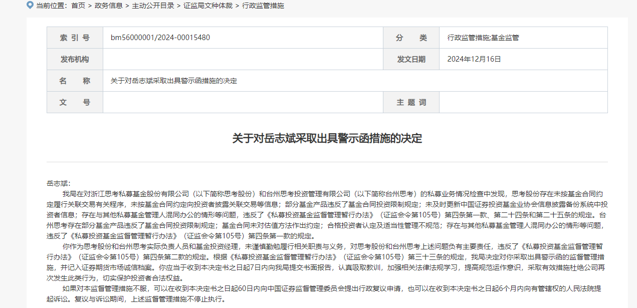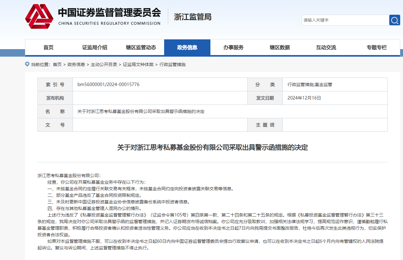 临近年末,私募基金行业迎来监管风暴。近日,多家知名私募机构因违规行为受到行政监管。12月16日,浙江思考私募基金股份有限公司(思考股份)及其关联公司台州思考投资管理有限公司均被浙江证监局出具警示函。