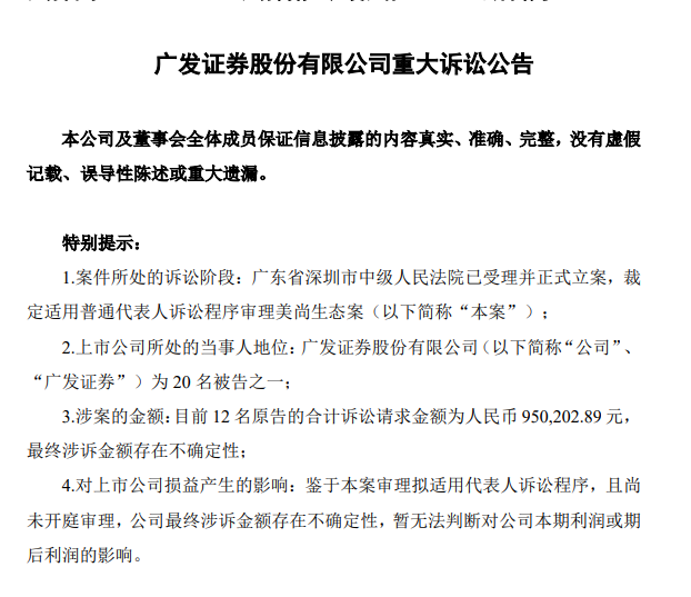 广发证券与东兴证券均表示,鉴于该案拟适用代表人诉讼程序且尚未开庭审理,最终涉诉金额存在不确定性,目前无法评估对公司利润的具体影响。