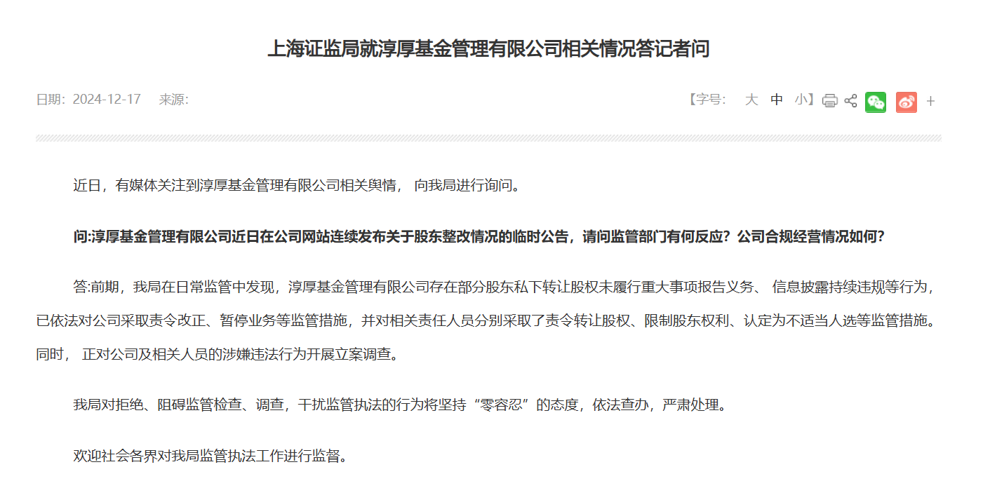上海证监局回应淳厚基金管理有限公司因股东私下转让股权未履行报告义务及信息披露违规等问题,已采取责令改正、暂停业务等监管措施,并对相关责任人进行处罚,目前正立案调查。