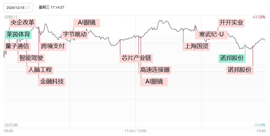 财联社12月18日讯,今日市场交投活跃,98只个股涨停,封板率高达78%,友阿股份、益民集团等强势连板。沪深两市成交额为1.36万亿,较前一日缩量1498亿。盘面上,市场热点快速轮动,短线情绪显著回暖,全市场逾百股涨停或涨超10%。板块方面,脑机接口、AI眼镜、半导体板块表现抢眼,而旅游、冰雪产业、食品等板块则跌幅居前。截至收盘,沪指微涨0.62%,深成指涨0.44%,创业板指微涨0.04%。