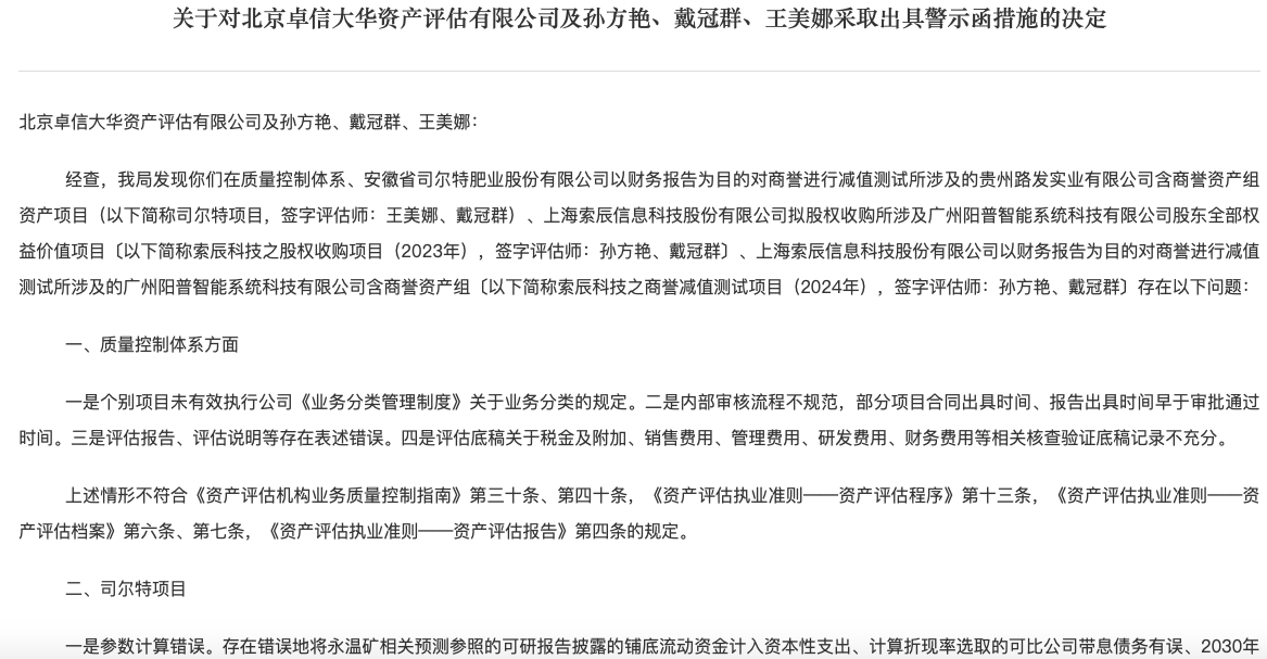 具体来看,卓信大华在多个项目中未有效执行《业务分类管理制度》,内部审核流程不规范,评估报告存在多处表述错误,且评估底稿相关核查验证记录不充分。此外,在司尔特项目和索辰科技项目中,还存在参数计算错误、评估底稿记录不充分、评估程序执行不到位等问题。