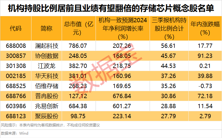 从行情表现来看,Wind存储器概念指数年内累计上涨21.71%。在机构预测今年全年净利润有望翻倍增长的9股中,有5股的年内股价涨跌幅低于20%,呈现滞涨特征。其中,兆易创新、澜起科技、江波龙、佰维存储今日均获得主力资金净流入。