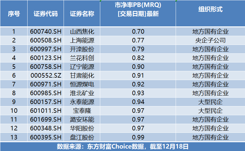 在煤炭板块37只个股中,截至12月18日,有13家市净率PB(MRQ)不足1倍,其中11家为央企或国企。