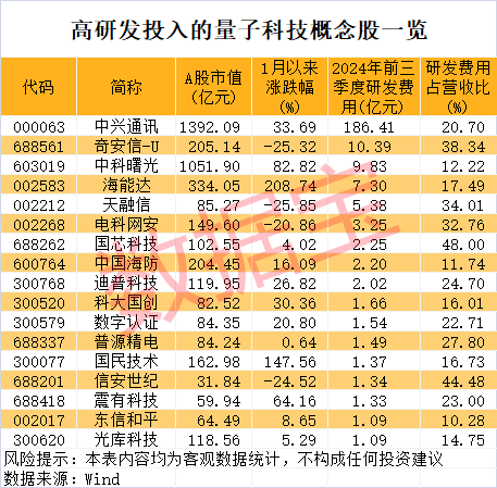 在前沿科技领域,高强度的研发投入是占据领先地位的关键。据数据宝统计,今年前三季度,量子科技概念股合计研发费用达到401.87亿元,占营收比例的6.98%。其中,34只股票研发费用超过1亿元,17只股票研发费用占营收比例超过10%。