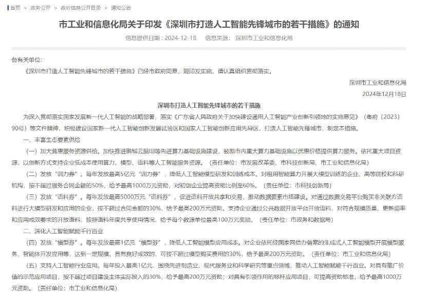 人工智能(AI)领域再迎重大利好!12月18日,深圳市工信局正式发布了《深圳市打造人工智能先锋城市的若干措施》,旨在通过设立百亿级人工智能产业基金,构建多元化资本生态,支持AI企业快速发展。