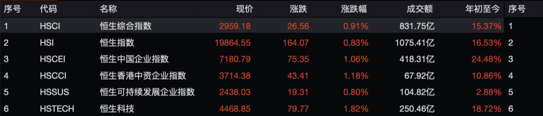 12月18日,港股市场迎来全面上涨,恒生指数、恒生科技指数及恒生国企指数分别收涨0.83%、1.82%和1.06%。大市成交额缩减至1075.41亿港元,南向资金净买入20.7亿港元。公用事业、资讯科技、工业等板块涨幅居前,汽车股普遍上涨,其中理想汽车-W涨幅超过5%。