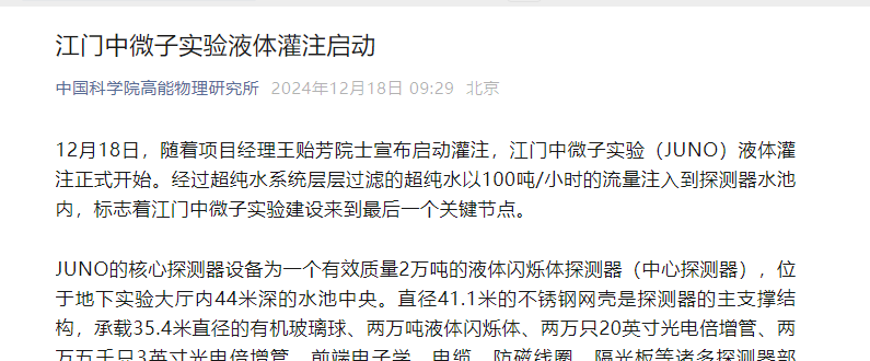江门中微子实验(JUNO)12月18日正式启动液体灌注,超纯水以100吨/小时流量注入探测器,标志着实验建设进入最后阶段,预计2025年8月完成全部灌注任务并开始运行取数。